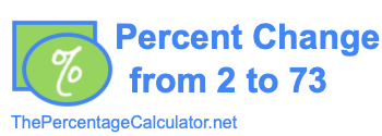 The three steps above can be made into a formula. Thus, to find the percent change from 2 to 73, we use this formula: