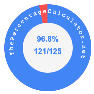 The illustration below shows 96.8 percent and 96.8 as a fraction on a pie chart. As you now know, 96.8% is the same as 121/125.