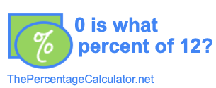 When you ask "0 is what percent of 12?" you are asking what share per hundred (percent) 0 is of 12 (0 is what % of 12?). To show you how to calculate the answer we start by displaying the percent formula below:
