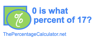 When you ask "0 is what percent of 17?" you are asking what share per hundred (percent) 0 is of 17 (0 is what % of 17?). To show you how to calculate the answer we start by displaying the percent formula below: