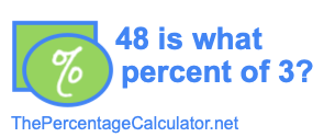 When you ask "48 is what percent of 3?" you are asking what share per hundred (percent) 48 is of 3 (48 is what % of 3?). To show you how to calculate the answer we start by displaying the percent formula below: