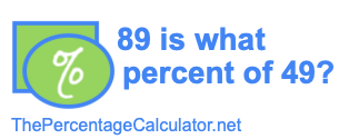 When you ask "89 is what percent of 49?" you are asking what share per hundred (percent) 89 is of 49 (89 is what % of 49?). To show you how to calculate the answer we start by displaying the percent formula below: