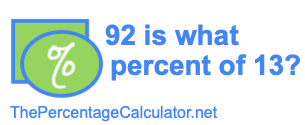 When you ask "92 is what percent of 13?" you are asking what share per hundred (percent) 92 is of 13 (92 is what % of 13?). To show you how to calculate the answer we start by displaying the percent formula below:
