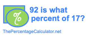 When you ask "92 is what percent of 17?" you are asking what share per hundred (percent) 92 is of 17 (92 is what % of 17?). To show you how to calculate the answer we start by displaying the percent formula below: